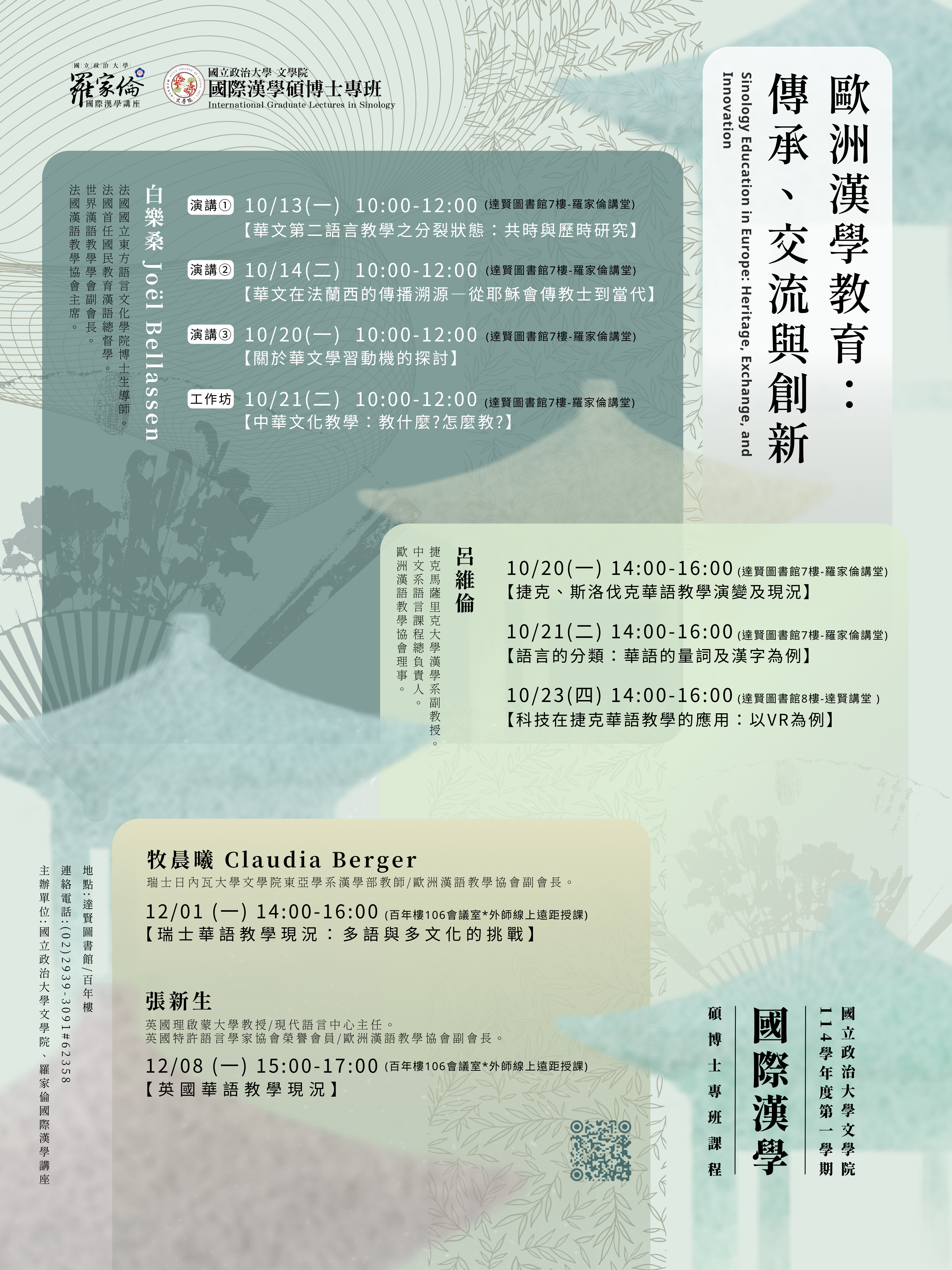 「歐洲漢學教育:傳承、交流與創新」課程海報,誤植12月1日及12月8日之協同教師與課程主題,現已更新為正確授課資訊,敬請參考最新版本之海報內容。